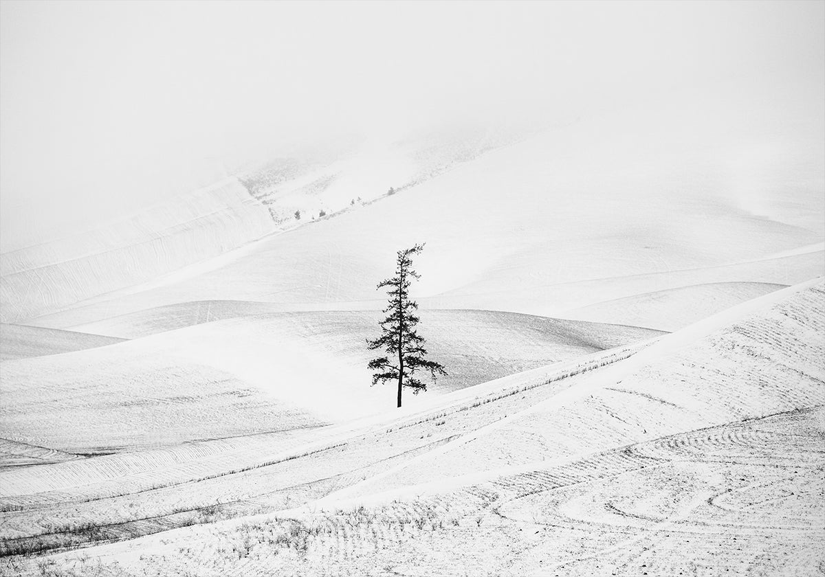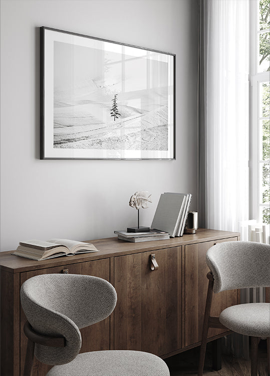 Eine poetische Winterlandschaft von Vlad Sadovsky: Der Nebel schwebt über sanften Hügeln, in denen eine einsame Tanne als stiller Mittelpunkt aufragt. Die monochrome, helle Atmosphäre betont die feinen Texturen des Frosts und sorgt für Ruhe, Besinnung und zeitlosen Minimalismus in Ihrem Raum. Perfekt für nordisches Dekor und ruhige, minimalistische Wände.