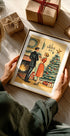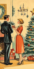 Treten Sie ein in einen kerzenbeleuchteten, schneebedeckten Abend, an dem der Charme der Jahrhundertmitte funkelt. Eine selbstbewusste Frau in einem leuchtend roten Kleid und ein eleganter Herr verweilen an einem schimmernden Weihnachtsbaum, die Schaufenster erstrahlen. Malerische Striche und Vintage-Töne hüllen die Szene in gemütliche Nostalgie und festliche Romantik. Perfekt, um einen warmen Urlaubsschwerpunkt zu schaffen.