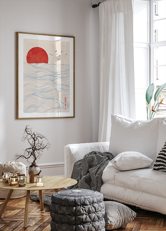 Das „Red Sun“-Poster ist eine ruhige und elegante Komposition, inspiriert vom japanischen Minimalismus. Mit einer leuchtend roten Sonne über sanft dahinrollenden blauen Meereswellen spiegelt dieses Kunstwerk die Harmonie zwischen Natur und Einfachheit wider. Der sanft beige Hintergrund verleiht dem Poster einen traditionellen Touch und macht es ideal für moderne, Zen- oder skandinavische Interieurs. Ein perfektes Geschenk für alle, die japanische Kunst, Minimalismus und Küstenlandschaften lieben.