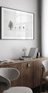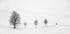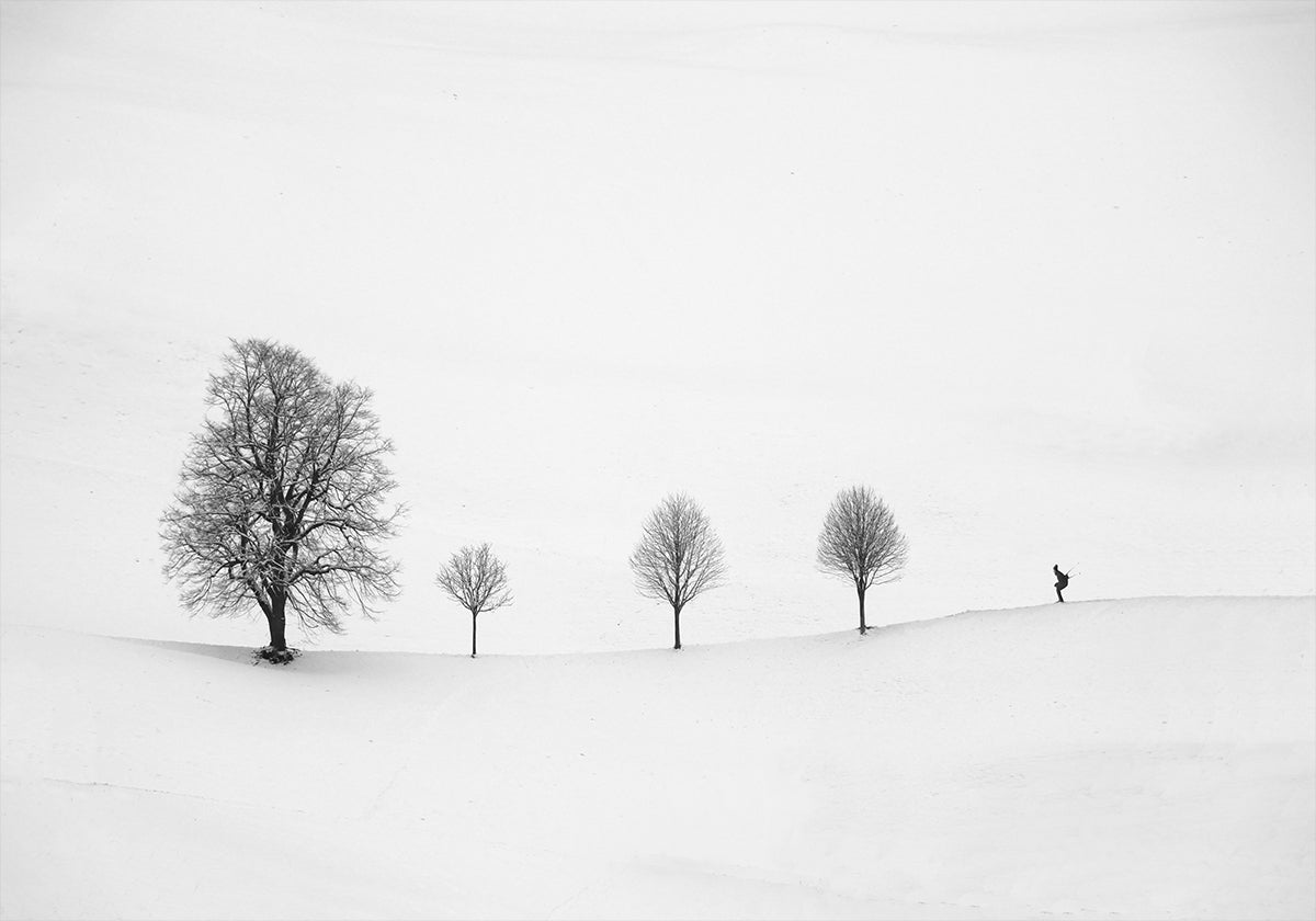 Ein grafisches, prägnantes Wintermotiv von Peter Svoboda MQEP: Ein einsamer Skifahrer schneidet Spuren in einen fast weißen, schneebedeckten Berghang, während ein paar dunkle Bäume und Umrisse einen minimalistischen Kontrast bilden. Die monochrome Komposition strahlt Ruhe, Kälte und Konzentration aus – ein poetischer Moment in Bewegung. Das Motiv balanciert Leere und Struktur in einem strengen, grafischen Ausdruck.