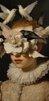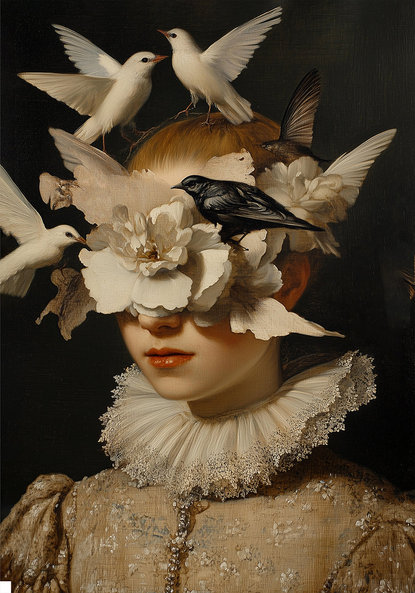 „Quiet Bloom“ von Dikhotomy kombiniert ein verträumtes, neoklassizistisches Porträt einer anmutigen Frau mit floralen Motiven und einem dunklen Raben. Sanfte Pinselstriche und barocke Poesie erzeugen eine ruhige Intensität, in der die Blätter und Blumen der Natur die Figur umhüllen und der Blick zum ruhigen Nachdenken einlädt. Eine poetische Begegnung zwischen Mensch und Natur.