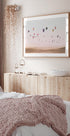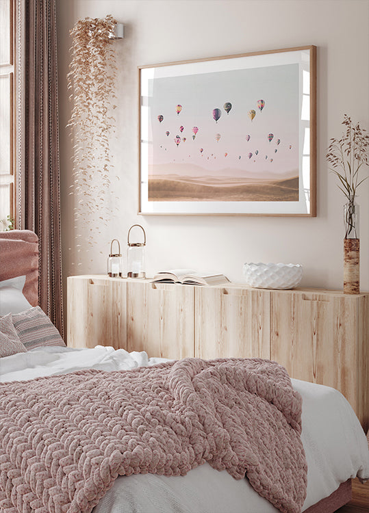 Ein verträumtes Foto von bunten Heißluftballons, die über goldenen Sanddünen unter einem pastellfarbenen Himmel schweben. Das Kunstwerk fängt die Magie des Reisens, der Freiheit und des Abenteuers ein und macht es zu einem wunderschönen Stück für jede von Fernweh inspirierte Dekoration.