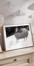 Eine verträumte Winterstimmung entfaltet sich in einer poetischen Illustration von Olga Skomorokhova: Ein sanftes, wolliges Schaf tritt in einer frostigen Landschaft hervor, in der Schneeflocken die Geräusche dämpfen und die Nacht schwach schimmert. Ländliche Ruhe und eine Prise Humor verleihen dem Motiv eine warme, gemütliche Ausstrahlung – perfekt für nordische, natürliche Einrichtung.