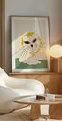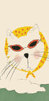 Eine skurrile Illustration im Retro-Stil einer Katze mit eleganter Sonnenbrille und einem gelb gepunkteten Schal. Mit verspielten Linien und einem nostalgischen Mid-Century-Flair vereint dieses Stück Humor und Charme und setzt ein freudiges Statement für Katzenliebhaber und Retro-inspirierte Innenräume.