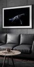 Ein kraftvolles, zurückhaltendes Unterwasserfoto eines majestätischen Buckelwals, der anmutig durch die dunklen Tiefen des Ozeans schwimmt. Dieses dramatische Kunstwerk fängt sowohl die Größe als auch die Schönheit eines der wahren Giganten der Natur ein und eignet sich perfekt, um in jedem Raum eine mutige und inspirierende Stimmung zu schaffen.