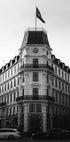 Ein majestätisches Schwarz-Weiß-Foto eines historischen Gebäudes in Kopenhagen, gekrönt von einem Glockenturm und einer eleganten Flagge. Die detaillierte Fassade und die großartige Symmetrie spiegeln den zeitlosen europäischen Charme wider und machen diesen Druck zu einem anspruchsvollen Wandkunstwerk für Innenräume, die von Architektur, Kultur und klassischem Stadtleben inspiriert sind.