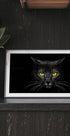Ein kraftvolles Nahaufnahmeporträt einer schwarzen Katze mit durchdringenden gelben Augen, die im Dunkeln leuchten. Dieses zurückhaltende Foto fängt Geheimnis, Eleganz und Intensität ein und macht es zu einem eindrucksvollen Kunstwerk für jedes moderne Interieur.