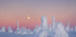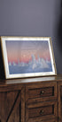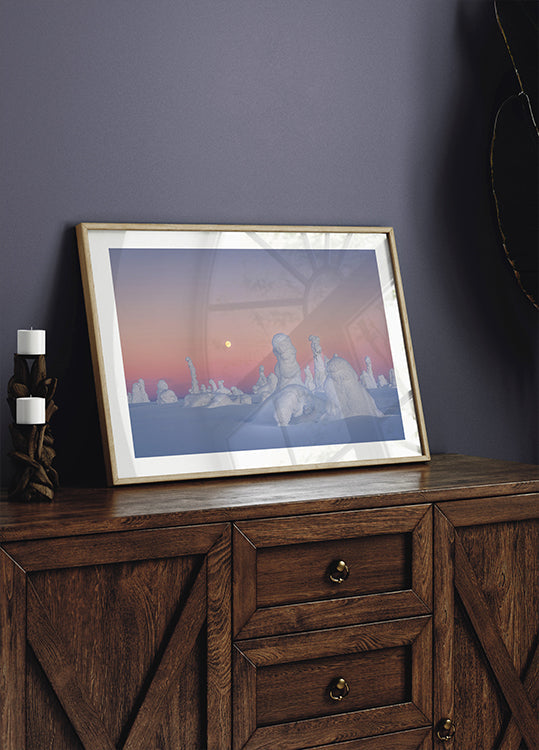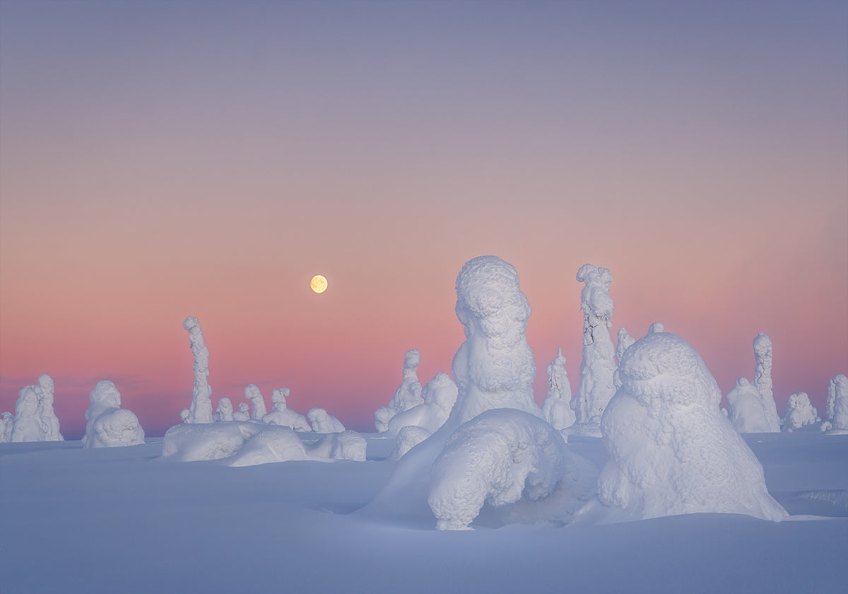 Dieses Bild zeigt eine zauberhafte Winterlandschaft, die bei Sonnenaufgang oder Sonnenuntergang in sanfte Pastelltöne getaucht ist. Der Schnee hat die Bäume so vollständig bedeckt, dass sie wie fast skulpturale, fantasievolle Figuren über das gefrorene Gelände verstreut stehen. Die Farben des Himmels wechseln von Rosa zu Lavendel, und ein klarer, leuchtender Mond hängt tief über dem Horizont und verleiht der Szene ein verträumtes und fast märchenhaftes Aussehen. Alles erscheint still, erstarrt und unendlich friedlich – wie eine Welt völlig ohne Zeit.