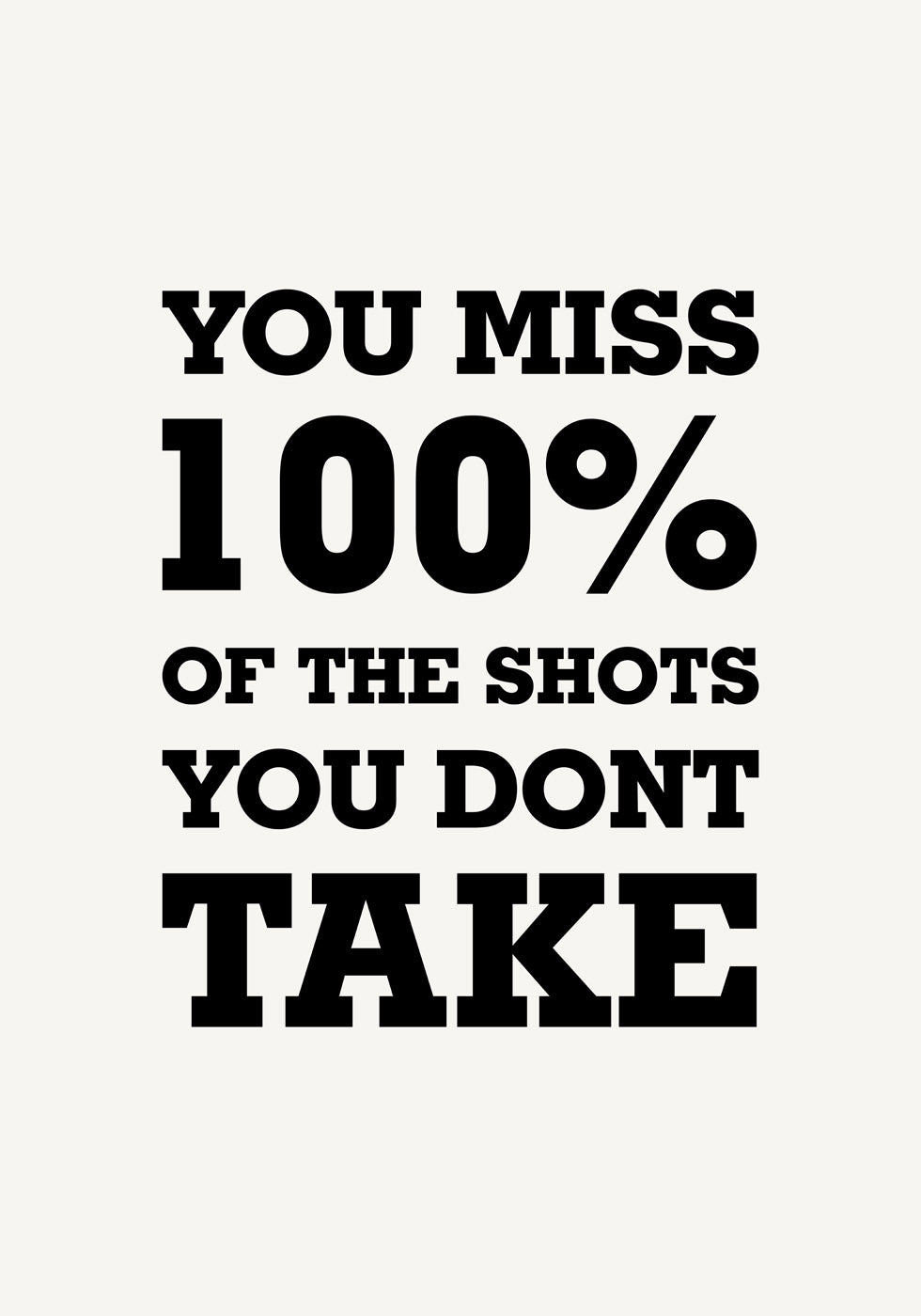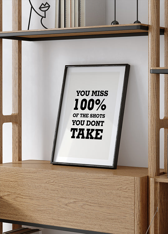 Ein kraftvolles und inspirierendes typografisches Poster mit dem berühmten Zitat: „Sie verpassen 100 % der Schüsse, die Sie nicht machen.“ Perfekt zur Motivation von Sportlern, Unternehmern und allen, die nach Erfolg streben. Eine großartige Wahl für Büros, Fitnessstudios oder private Räume, in denen Motivation wichtig ist.