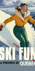 Ein Retro-inspiriertes Reiseplakat von Andreas Magnusson: Ein dynamischer Skifahrer in einem farbenfrohen Parka schneidet durch den Pulverschnee die Piste hinunter, während sich im Hintergrund die majestätischen Berge und dunklen Kiefernwälder Quebecs erheben. Klare, grafische Formen und gedämpfte Vintage-Farben fangen die frische nordische Winterstimmung für Abenteuer ein.
