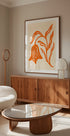 Stilisiertes Poster mit orangefarbenen Tulpen und Blättern