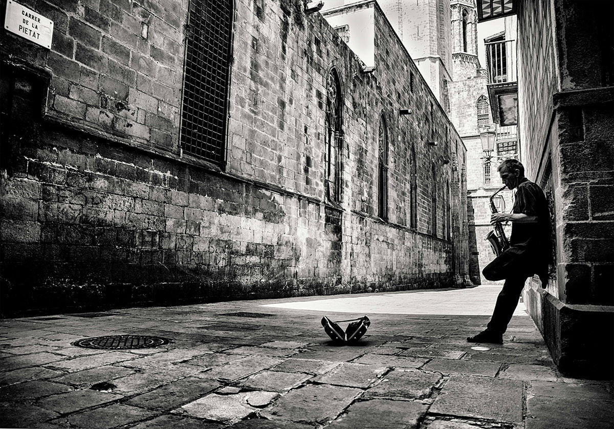 Eine stimmungsvolle schwarz-weiße Stadtszene: Ein einsamer Saxophonist ergießt Jazz in eine enge Straße Barcelonas, Balkone und Backsteinmauern umrahmen das Haus. GertJan van Geerenstein fängt den ruhigen Puls der städtischen Einsamkeit ein, wo Schatten, Perspektive und anhaltende Notizen die Gasse in eine Bühne verwandeln. Eine filmische Stille liegt in der Luft.
