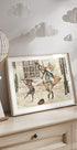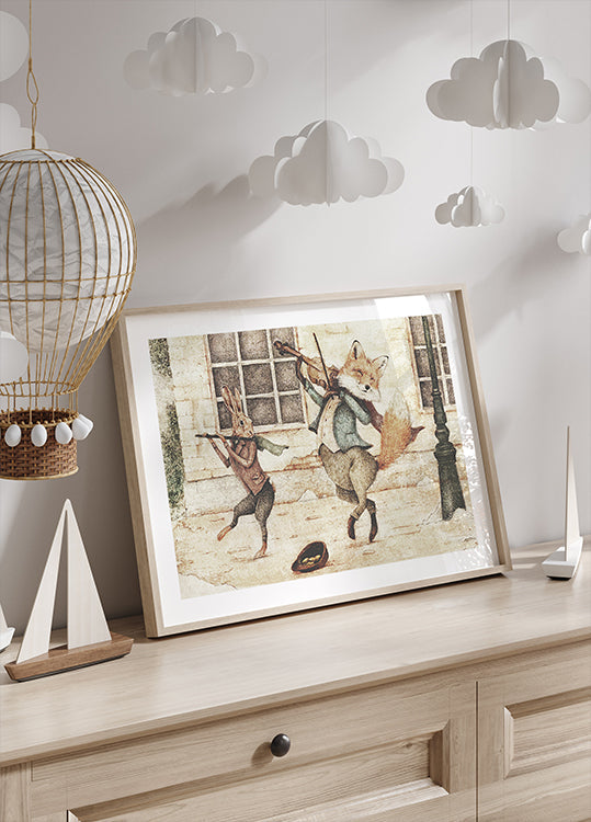 „Street Musicians“ von Mike Koubou zeigt eine winterliche Stadtszene, in der ein eleganter Fuchs und ein lebhafter Hase wie kleine Clowns auf der Straße Musik spielen. Warme Töne und Retro-Details schaffen eine abenteuerliche, nostalgische Atmosphäre – wie eine Seite aus einem altmodischen Bilderbuch – perfekt für ein Kinderzimmer, Wohnzimmer oder Eingangsbereich.