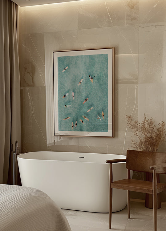 Ein erfrischendes Luftposter, das Surfer zeigt, die auf türkisfarbenem Wasser schwimmen und auf die nächste Welle warten. Dieses Küstenbild bringt Freiheit, Sonne und Sommerstimmung in moderne Häuser – perfekt für Strandliebhaber.