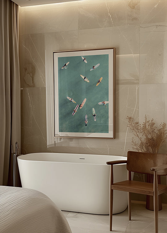 Ein erfrischendes Luftposter, das Surfer zeigt, die auf türkisfarbenem Wasser schwimmen und auf die nächste Welle warten. Dieses Küstenbild bringt Freiheit, Sonne und Sommerstimmung in moderne Häuser – perfekt für Strandliebhaber.