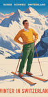 Reisen Sie mit Swiss Alpine Bliss von Andreas Magnusson zu den höchsten Gipfeln der Schweiz. Ein Retro-inspiriertes Reiseposter, das die sonnenverwöhnten Alpengipfel, scharfen Schatten im sauberen Schnee und die Dynamik des Skifahrens auf breiten Pisten einfängt. Ein zeitloser Blick auf die klare Ruhe und das Abenteuer des Winters. Die Farben sind hell und nostalgisch, mit hohem Himmel und strahlend schneebedeckten Gipfeln.