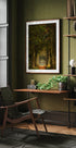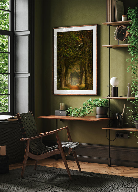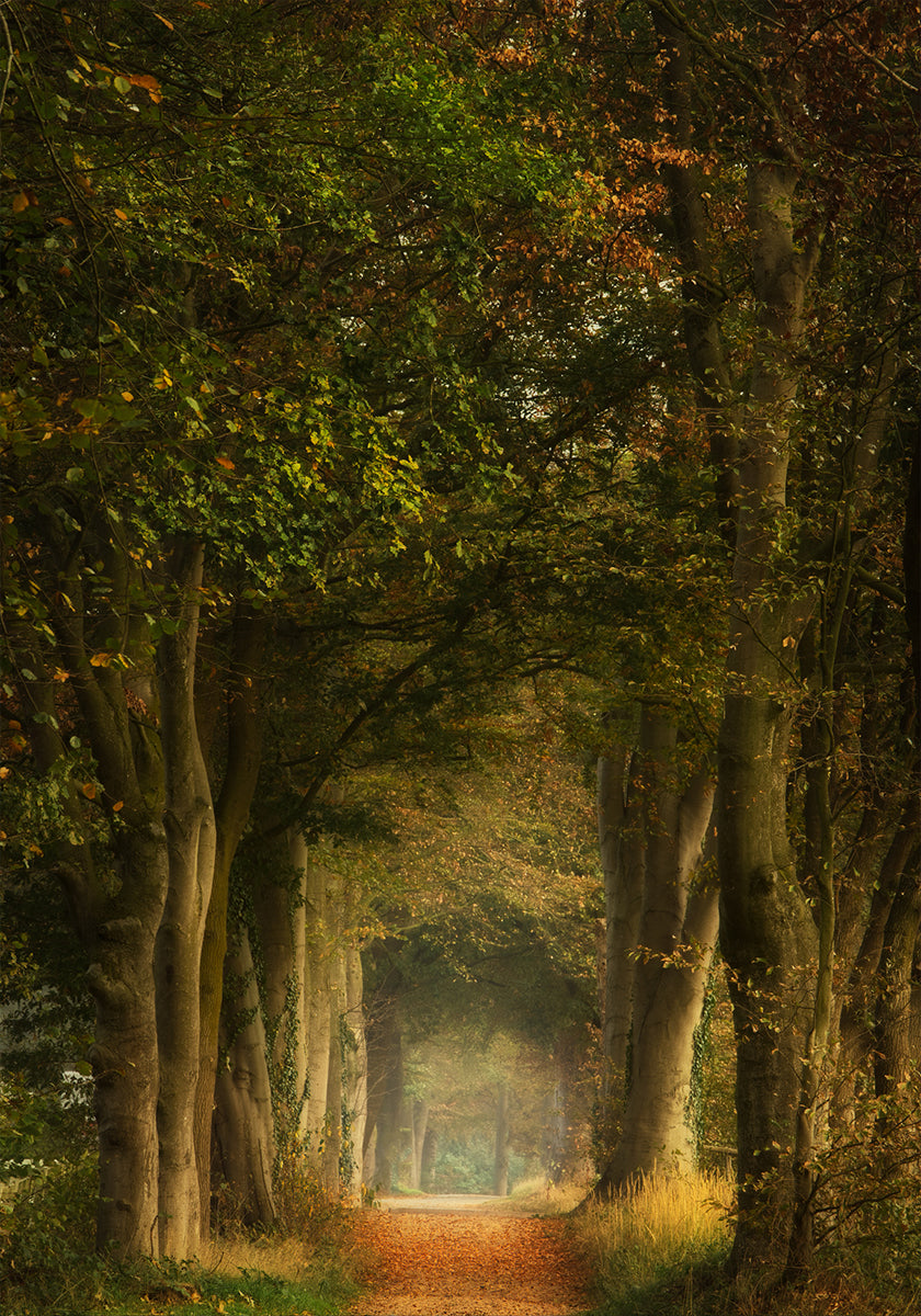 Ein verträumter Waldweg voller Herbstblätter, umgeben von hohen Bäumen und sanftem goldenem Licht. Dieses Kunstwerk fängt die stille Schönheit der Natur ein und weckt Gefühle von Frieden, Besinnung und zeitlosen Reisen durch bezaubernde Wälder.