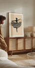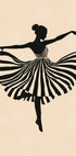Eine anmutige schwarze Silhouette einer Ballerina in der Mitte einer Pirouette, wobei das gestreifte Kleid in eleganten Bewegungen fließt. Der sanfte beige Hintergrund und der starke Kontrast verleihen diesem Stück eine zeitlose, stilvolle Ausstrahlung – perfekt, um dem Wohnzimmer, Studio oder der Galeriewand künstlerische Bewegung zu verleihen.