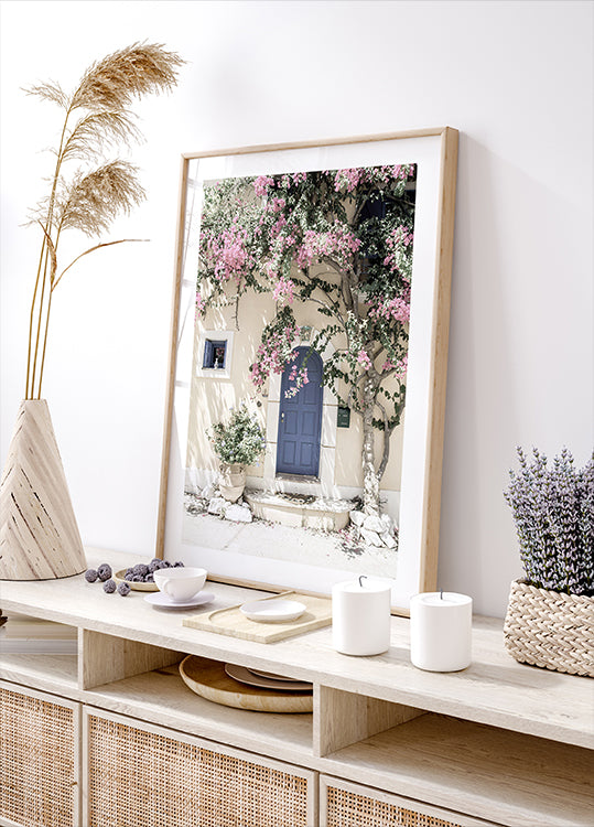 Eine bezaubernde mediterrane Szene mit einer leuchtend blauen Tür, umgeben von üppigen rosa Bougainvillea auf einer sonnendurchfluteten beigen Fassade. Dieses idyllische Motiv fängt die Essenz der griechischen Inseln ein und ist perfekt für ein Zuhause, in dem eine warme und friedliche Atmosphäre gewünscht ist.