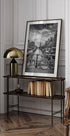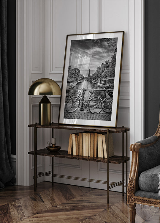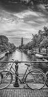 Eine stimmungsvolle, monochrome Darstellung von Amsterdam von Melanie Viola: Entlang der Oude Schans spiegelt der Kanal den Himmel, während Fahrräder am Geländer abgestellt sind und Hausboote vorbeifahren. Im Hintergrund erhebt sich unter bewölktem Himmel ikonisch der Montelbaan Tower über den historischen Fassaden – ruhige urbane Poesie. Ein zeitloser Blick auf die Seele der Stadt.