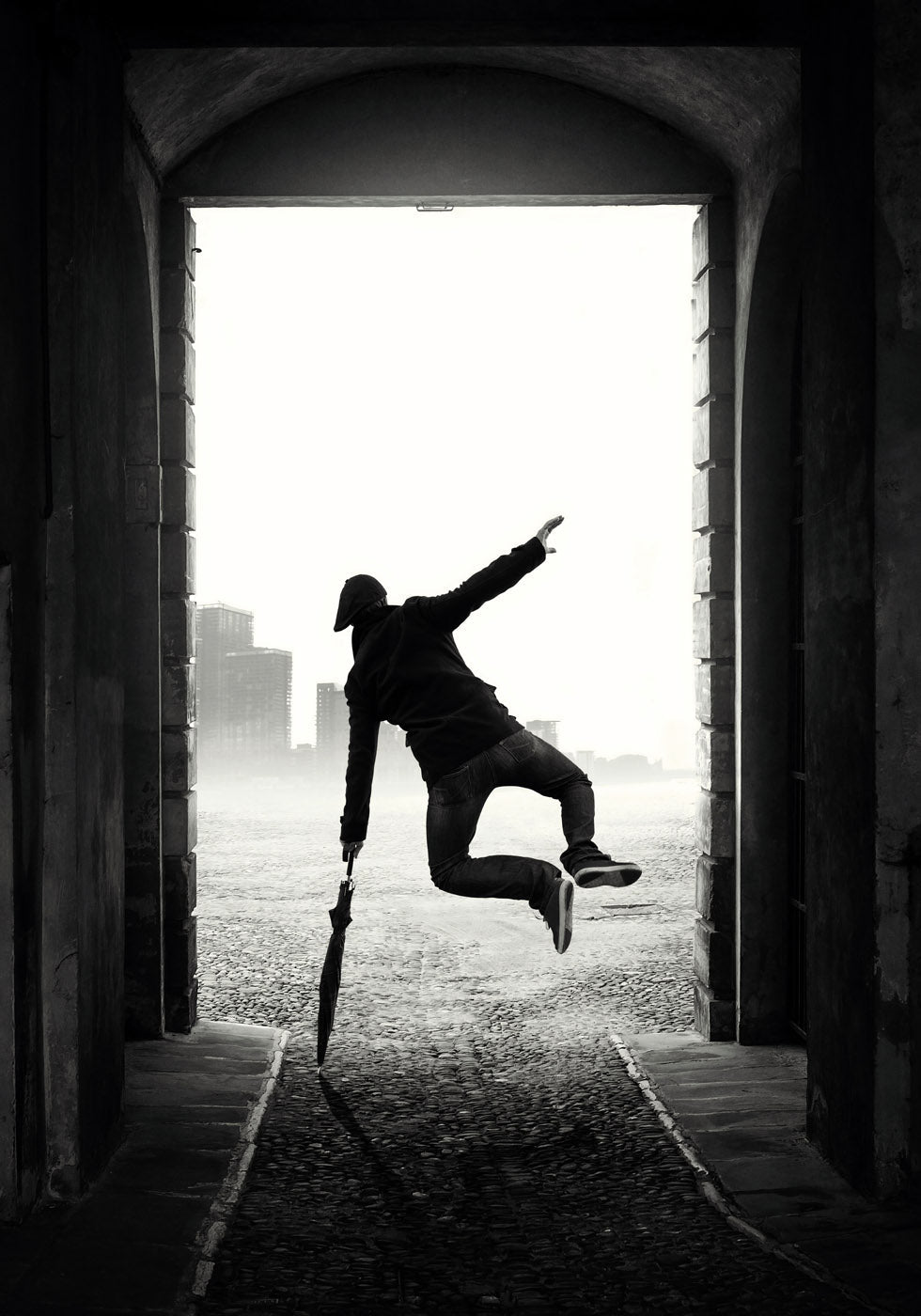 Ein dramatisches Schwarz-Weiß-Foto eines Mannes, der mit einem Regenschirm in der Hand in der Luft schwebt. Der Kontrast zwischen der dunklen Passage und der hellen Stadtsilhouette erzeugt eine atmosphärische und künstlerische Wirkung. Eine perfekte Wanddekoration, die Energie, Freiheit und Freude in jeden modernen Raum bringt.