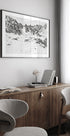 „Snowy Mountain Peaks“ von Del Mundo Imagery fängt die raue Poesie des Winters ein: Schroffe, schneebedeckte Gipfel erheben sich über einem ruhigen Tal, in dem dunkle Kiefernwälder im Nebel verschwinden. Das monochrome Licht schneidet scharfe Konturen zwischen Schnee und Schatten und schafft so eine ruhige, dramatische Atmosphäre ferner Wildnis. Der Horizont erscheint im Dunst und die Stille ist spürbar.