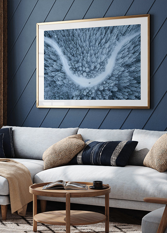 Eine atemberaubende Luftaufnahme einer verschneiten Landstraße, die sich durch dichte, dunkle Kiefernwälder schlängelt. Kleine Autos säumen die Strecke und verleihen ihr Maß, während sich die stille Stille des Winters über die Landschaft legt. Die scharfen Kontraste zwischen weißem Schnee und satten Grüntönen schaffen einen grafischen, minimalistischen Ausdruck von Gerald Macua.