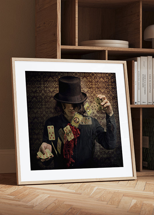 Versuchen Sie Ihr Glück von Kiyo Murakami zeigt einen mysteriösen Illusionisten mit Hut, gefangen zwischen Schatten und magischen Blitzen. Spielkarten wirbeln um ihn herum, während Symbole wie Herzen, Karo, Krallen und Pik das Spiel des Schicksals andeuten. Eine abgenutzte Vintage-Ästhetik trifft auf futuristisches Flair und weckt die Neugier. Es verspricht einen Hauch von Geheimnis im Zuhause.