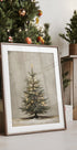 Ein sanft bemalter Weihnachtsbaum im Vintage-Stil steht in ruhigem Winterlicht mit kleinen goldenen Lichtern zwischen den tiefgrünen Zweigen. Der neutrale, strukturierte Hintergrund und ein leichter Hauch von Schnee verleihen dem Motiv eine ruhige und nostalgische Weihnachtsatmosphäre – perfekt für gemütliche saisonale Dekorationen, klassische Galeriewände oder skandinavische Häuser.
