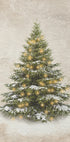 Ein gemütlicher, immergrüner Baum im Vintage-Stil steht leicht mit Schnee bedeckt, während warme goldene Lichter zwischen den Zweigen funkeln. Der gedämpfte, papierstrukturierte Hintergrund und der sanfte Schneefall schaffen eine ruhige und nostalgische Weihnachtsatmosphäre – ideal für eine klassische saisonale Bilderwand oder eine einfache Winterecke.