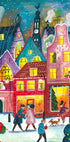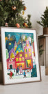Erleben Sie die Weihnachtsstimmung in Caroline Bonne Müllers „Weihnachten in Amsterdam“. Eine farbenfrohe Illustration von schneebedeckten Kanalhäusern, dekorierten Fenstern und einer funkelnden Weihnachtsbaumszene am Wasser. Hund und Passanten erwecken das verschneite Wetter zum Leben, während warme Lichter einen Kontrast zur frostigen Nacht bilden. Eine Hommage an den Winterzauber und die gemütlichen Straßen der Stadt.