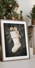 Ein elegantes Weihnachtsposter mit einem weißen Weihnachtsstrumpf mit flauschigem Rand, verziert mit Tannenzweigen, Tannenzapfen und einer goldenen Schleife. Der helle, leicht mattierte Hintergrund betont das Grün und sorgt für Ruhe. Ein klassisches, zeitloses Motiv, das die ganze Saison über Wärme, Tannenduft und traditionelle Weihnachtsstimmung ins Zuhause bringt. Mit Grün- und Goldtönen.