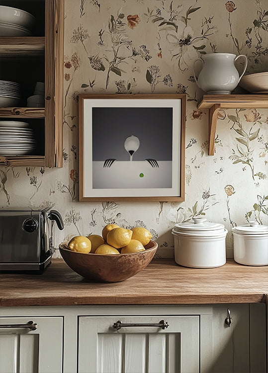 Ein verspieltes und leicht kokettes Poster von Wieteke de Kogel: Eine einzelne grüne Erbse wird von Löffel und Gabel umworben, die fast Persönlichkeit gewinnt. Die klaren Linien, der frische grüne Akzent und die grafische Ruhe machen das Motiv zu einem modernen Gesprächsthema in der Küche, im Esszimmer oder in der Café-Ecke – mit einem charmanten Augenzwinkern.