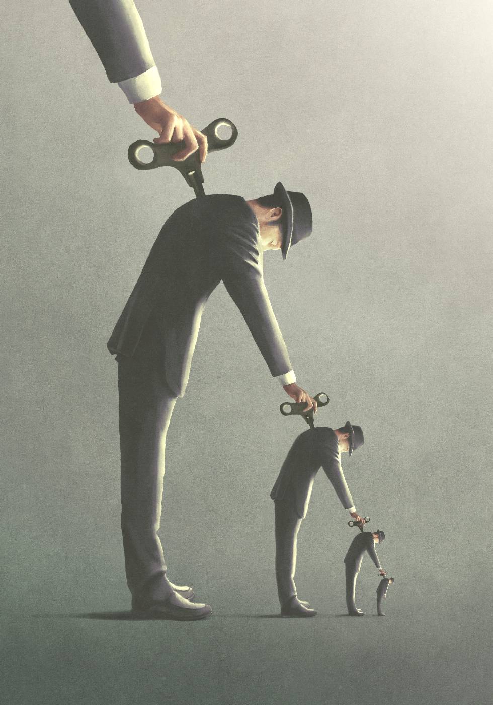 Eine visuelle Geschichte über Männer in einer endlosen Kette, die sich gegenseitig mit Aufziehschlüsseln hochziehen. Das Werk hinterfragt die menschliche Freiheit in einem System, das von Routine und Erwartung geprägt ist.