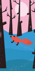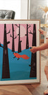 Winter Fox von Nicholas zeigt einen Rotfuchs in einem ruhigen Winterwald, der vom Mondlicht beleuchtet wird. Geometrische Formen und feine Linien treffen in einer minimalistischen, verspielten Komposition mit sanften Pastelltönen in Rosa und Blau aufeinander. Schneebedeckte Bäume und ein klarer Nachthimmel verleihen dem Motiv eine verträumte, poetische Ruhe. Perfekt für Kinderzimmer und moderne Innenräume.