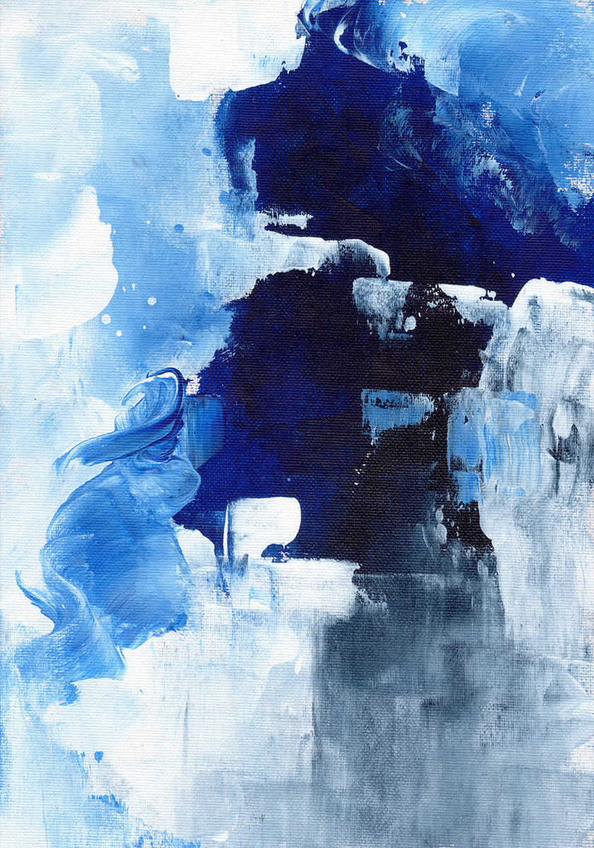 Eine winterliche Dunkelheit entfaltet sich in tiefen Blautönen und kühlen Pinselstrichen, die wie Schneeflocken in der Nacht tanzen. Abstrakte Schichten deuten auf Frost, Schatten und ruhiges Licht hin, wie ein Schimmer von Nordlichtern über einer gefrorenen Landschaft. Winter Night von Ejaaz Haniff vereint Ruhe und Bewegung in einem poetischen, farbgesättigten Blick auf die Schönheit der Kälte.