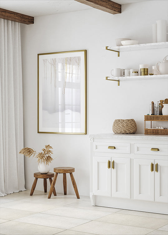 „Winter Reflection“ von Laurentiu Pavel fängt die nordische Winterstille ein: Kahle Bäume stehen als grafische Silhouetten an den Ufern, perfekt gespiegelt in einem eisigen Wasser. Die helle, hell erleuchtete Atmosphäre und die begrenzte Palette an Weiß- und Grautönen schaffen Ruhe, Harmonie und eine meditative Tiefe im Raum. Eine poetische Winterlandschaft, die zum Nachdenken einlädt.