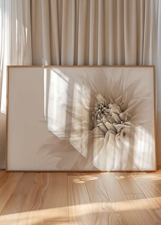 Eine raffinierte Nahaufnahme einer Dahlie in sanften Sepiatönen. Der monochrome Stil und die zarten Details der Blütenblätter verleihen dem Stück eine zeitlose und würdevolle Eleganz, perfekt für ruhige und moderne Innenräume.