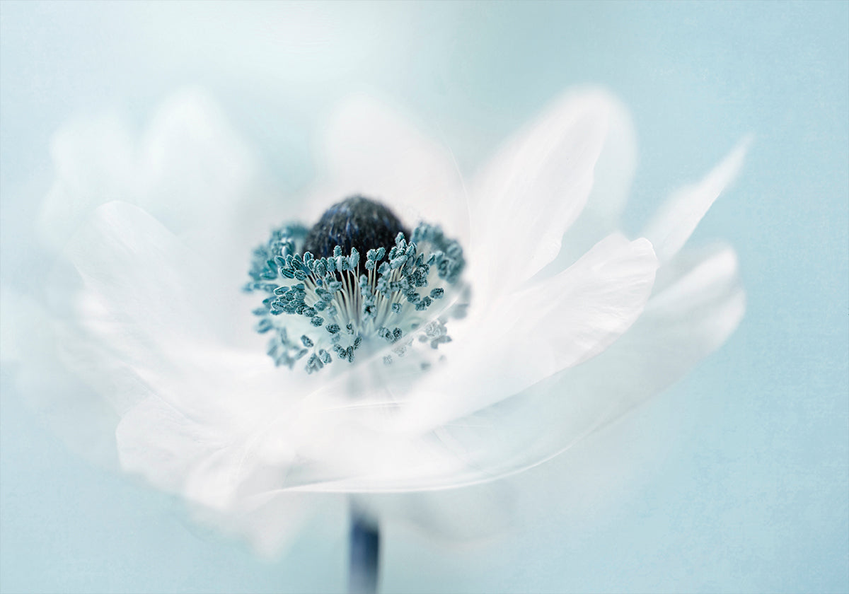 Eine zarte Makrofotografie einer weißen Blume mit türkisfarbenen Details, die eine verträumte und ätherische Stimmung erzeugen. Der weiche Fokus und die Pastellfarben strahlen Ruhe und Eleganz aus und machen das Werk ideal für Innenräume, die Harmonie und raffinierte Schönheit suchen.