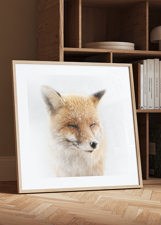 Lernen Sie die stille Freude des Winters kennen: einen flauschigen Rotfuchs, dessen Augen sanft geschlossen sind, während die Schneeverwehungen fallen, und der ein heiteres, zufriedenes Lächeln trägt. Der Frost küsst seine Schnurrhaare und sein Fell, während der sanfte weiße Hintergrund die Ruhe verstärkt. Ein bezauberndes Tierporträt der Künstlerin Doris Reindl, das Wärme, Humor und saisonalen Zauber ausstrahlt.