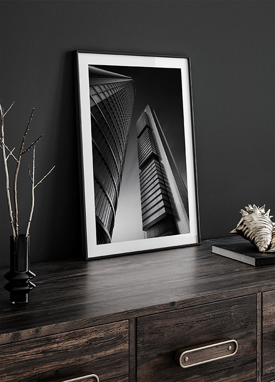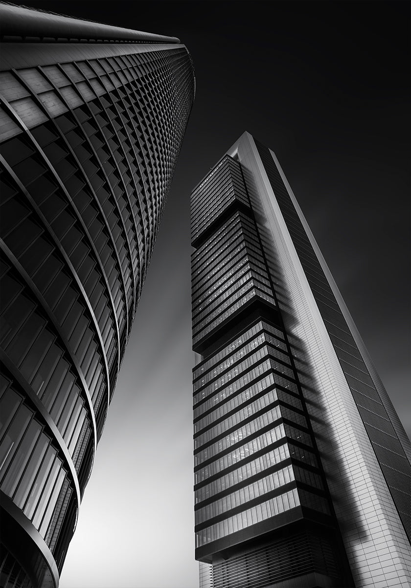 Together von Jorge Ruiz Dueso fängt eine Nachtszene aus Madrid ein, in der der Mond über der Skyline der Stadt schwebt. Aus dramatischer Perspektive ragen zwei moderne Gebäude in den Himmel, deren klare Linien und geometrischer Rhythmus gleichzeitig Ruhe und Aufregung erzeugen. Perfekt für Liebhaber der Architektur und des spanischen Nachtlebens.