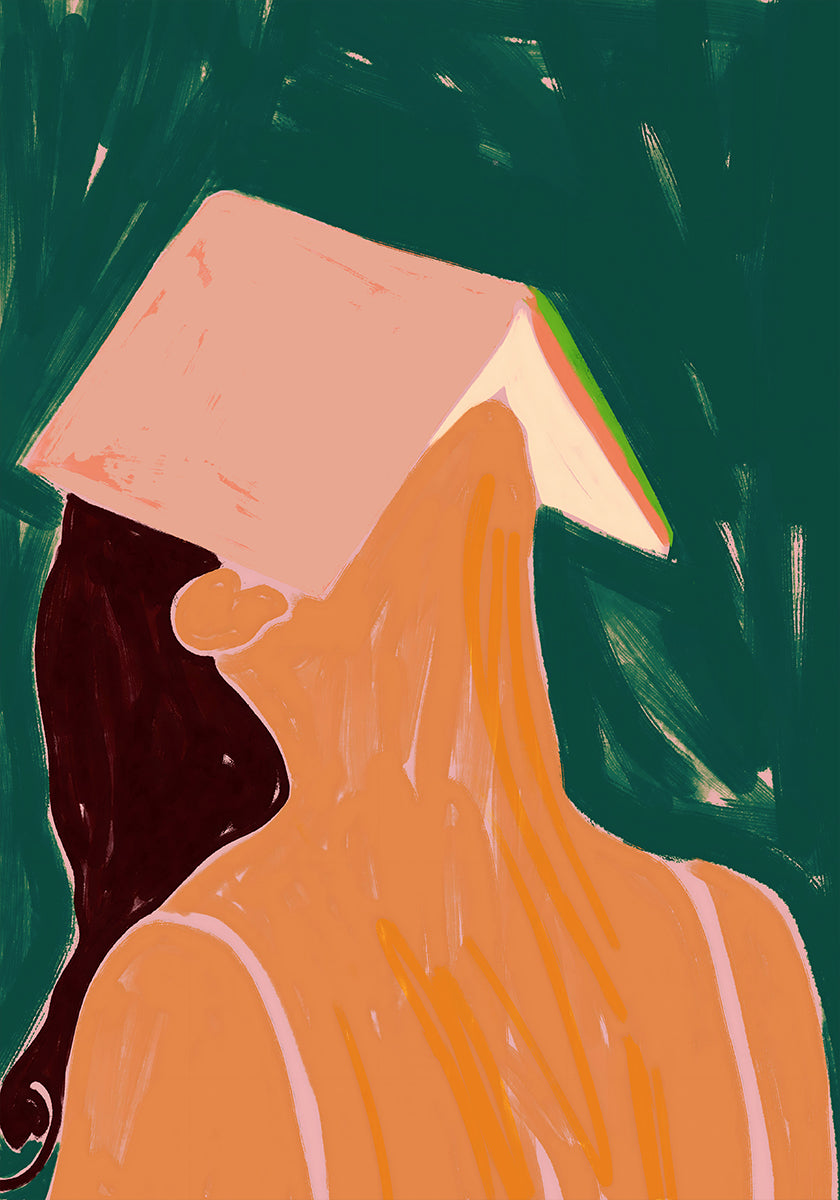 Reading Between the Lines von Uma Gokhale fängt einen ruhigen Moment der Kontemplation ein: eine ruhende Frau, vertieft in ihr Buch, umgeben von sanften Pastelltönen und subtilen Pinselstrichen. Licht und Schatten regen zum Nachdenken an, während die Komposition zu Nähe, Ruhe und dem stillen Zauber des Lesens einlädt. Ein modernes, poetisches Porträt über Lesefreude und stille Selbstreflexion.